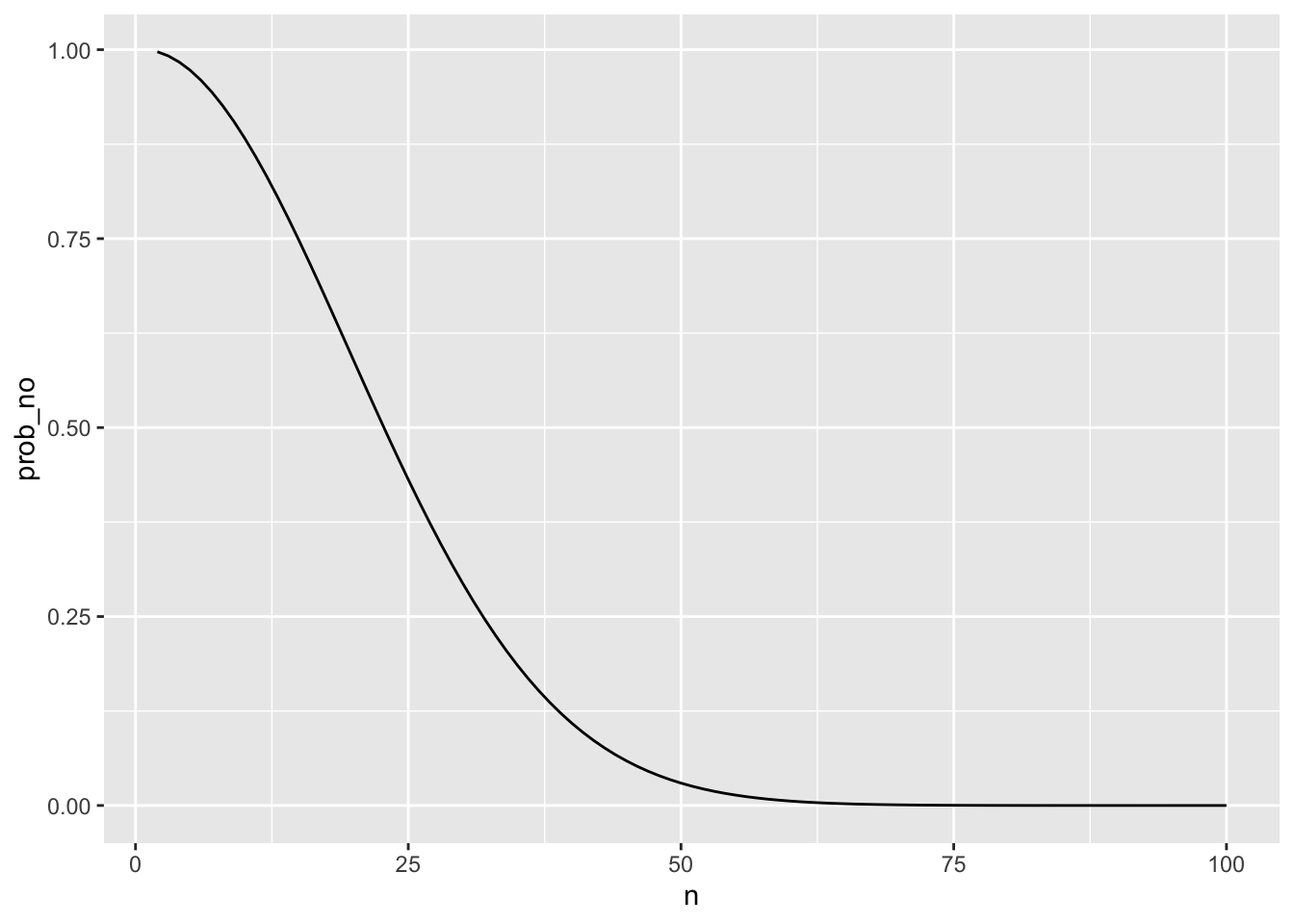 The following plot illustrates the relationship between the number of people in a room and the probability of at least 2 people sharing the same birthday.